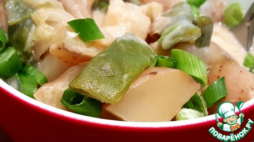 Нарезать молодой перчик. Он придаст блюду обалденный аромат.