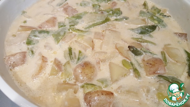 Нарезать картофель. Не слишком крупно, средними кусочками. Добавить к фасоли. Влить сливки и молоко. Увеличить огонь и дать жидкости закипеть. Уменьшить огонь.