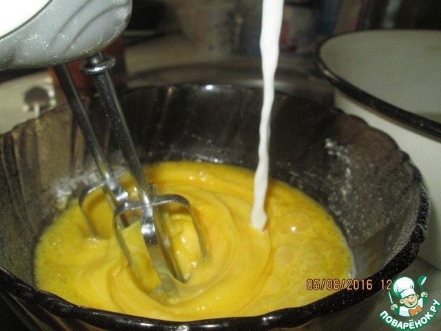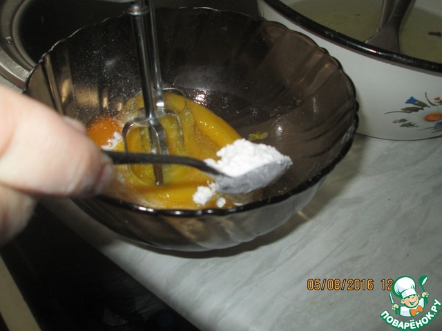 Начинаем взбивать миксером и по немногу добавляем муку.
