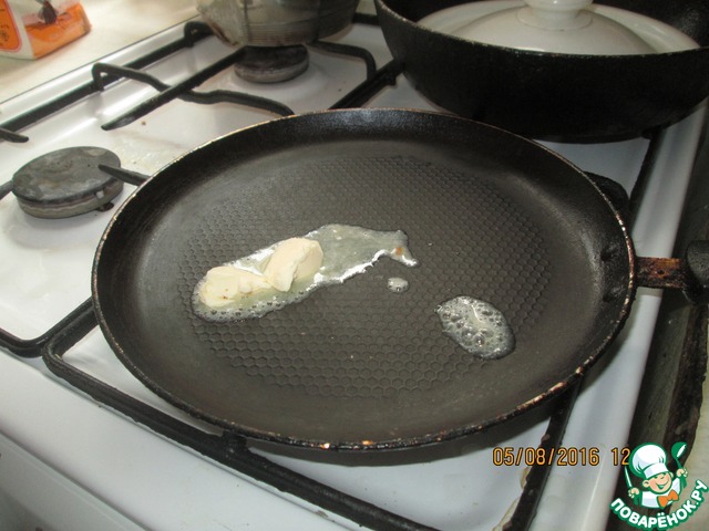 Тем временем разогреваем сковороду и кладём на неё ломтики масла.