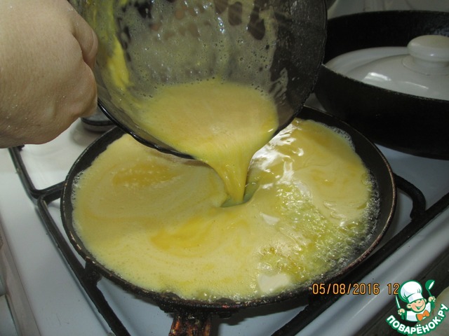 После того как мы разогрели сковороду выливаем в неё наш омлет.