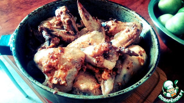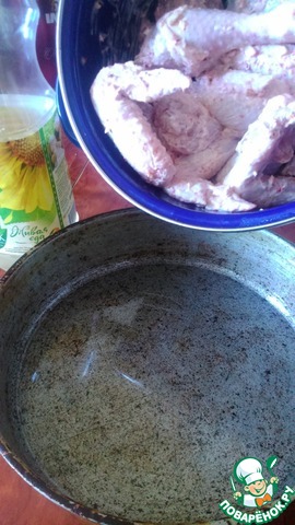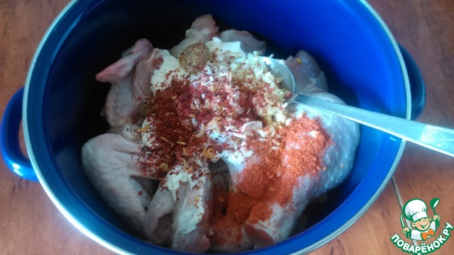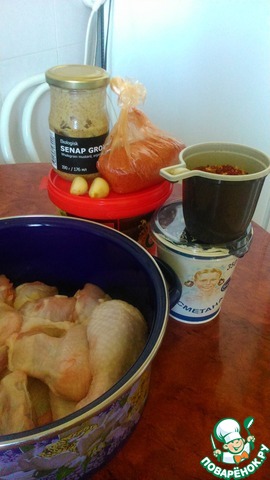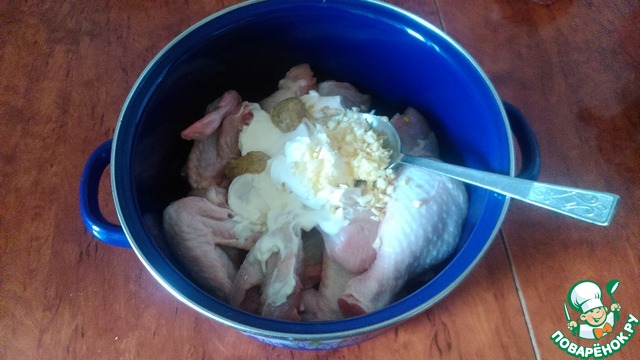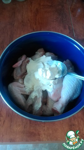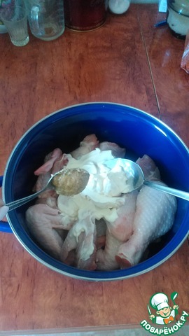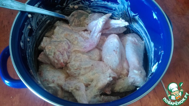 Хорошенько все перемешиваем. Далее важный момент- курица должна мариноваться хотя бы час-два. Если никуда не торопитесь, можно ждать больше времени, но тогда лучше убрать в холодильник