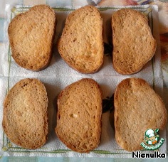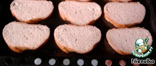 Выкладываем ломтики на противень. Ставим в духовку, следим за тем, чтобы нижняя сторона ломтика приобрела золотистый цвет. Переворачиваем ломтики на другую сторону.