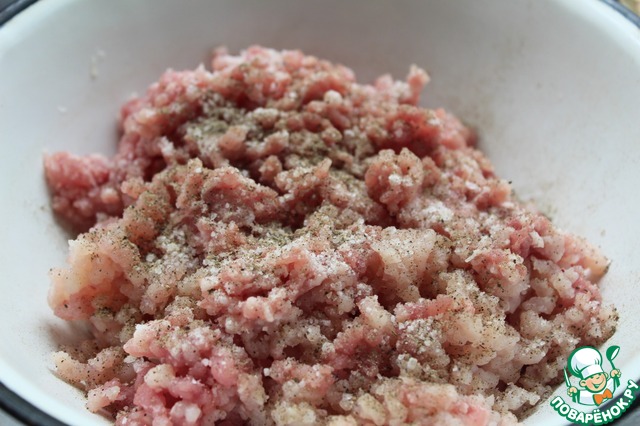 Прокрутить в мясорубке свинину и куриное филе, добавить соль и перец.