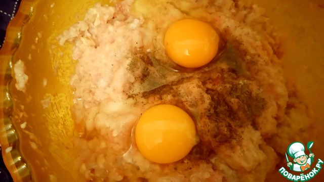 Добавить яйца, соль, перец. Хорошо вымешать.