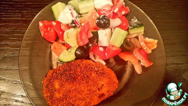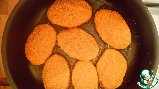 Сформовать котлетки, обвалять в сухарях. Мне очень нравятся крупные рыжие сухари, они дают хрустящую корочку.