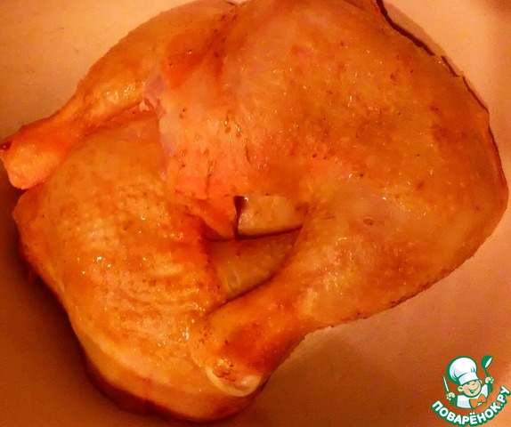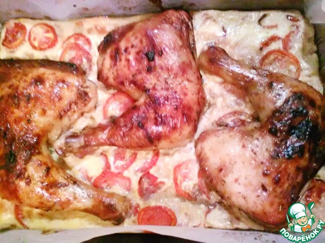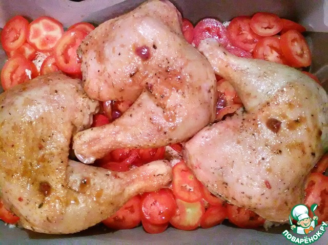 Выкладываем на помидоры, окорочка и отправляем в разогретую до 180 градусов духовку. Сок и жирок с окорочков впитается в овощи.