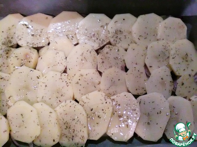 Равномерно распределяем по всей поверхности картофеля орегано. Сбрызгиваем оливковым маслом. И если брынза не соленая, солим немного.