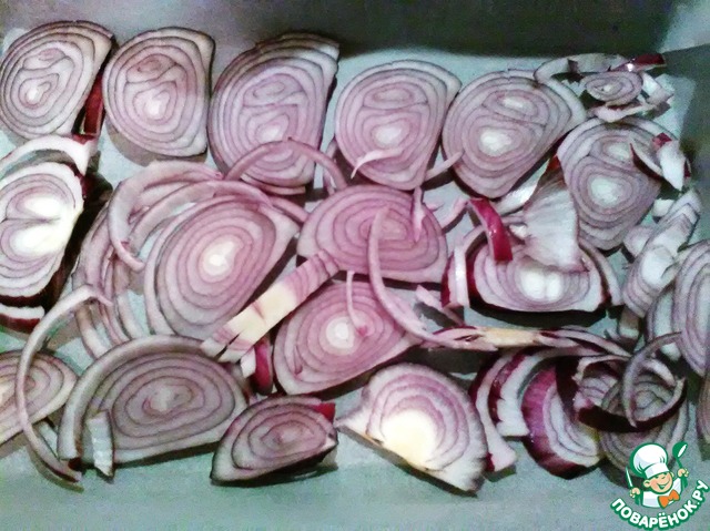 Первым делом, почистим лук и нарежем его кольцами. У меня лук очень крупный и одной луковицы хватило распределить на всю поверхность противня.