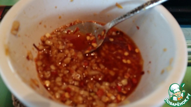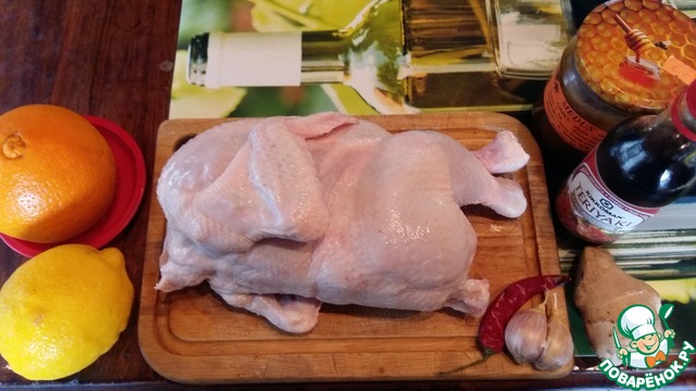 Готовим маринад. Чеснок измельчить и смешать с тертым имбирем и цедрой, лимонным и апельсиновым соком, медом и соусом-маринадом "Терияки" от ТМ "Киккоман". Обмазываем курицу маринадом и оставляем пропитываться на пару часов.