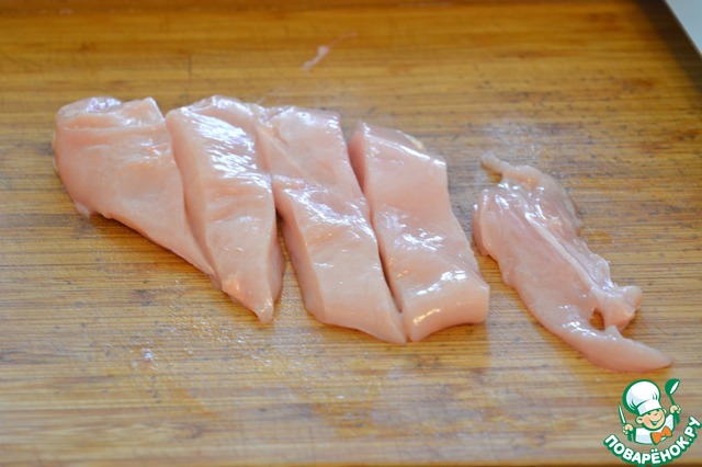 Куриное филе нарежьте на полоски и слегка посолите