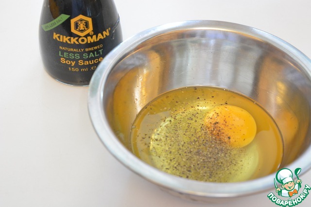 Яйцо взбейте с черным перцем и соевым соусом "Киккоман"
