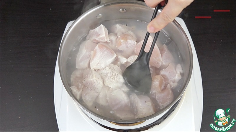Мясо режу небольшими кусочками. Выкладываю в кастрюлю, солю, перчу и заливаю водой, чтоб она слегка покрывала мясо. Мясо не обжариваю!