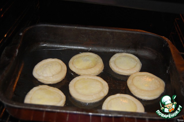 Слоенное тесто раскатать, рюмочкой вырезать 12 кружочков. Из 6 кружочков рюмочкой поменьше сделать кольца. Лепешки уложить на противень смоченный водой. Кольца уложить на смазанные желтком лепешки, чтобы края совпали. Поверхность колец также смазать яйцом не задевая края.