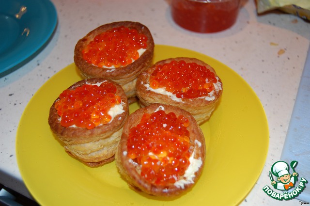 Волованам даем остыть. После чего наполняем их сливочным маслом и икрой.