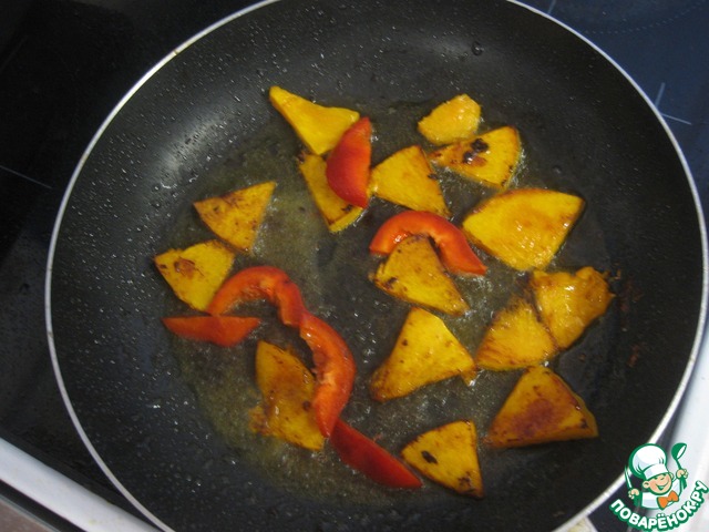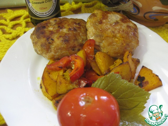 Убираем готовые котлеты на тарелку, тыкву режем кусочками, как вам больше нравится, перец соломкой и обжариваем минут 5 на этой же сковороде, в конце добавляем 1 ст. л. соевого соуса