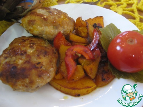 | Этот рецепт - чистая импровизация-отголосок предыдущего рецепта-закуски. В результате получились очень нежные, сочные котлетки, с яркими вкраплениями тыквенных "нитей", с гарниром из тыквы и перца! Быстрый, не хлопотный в приготовлении обед или ужин! |