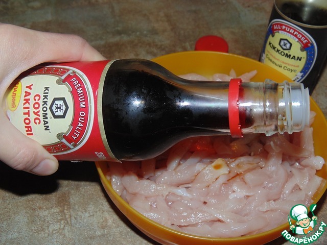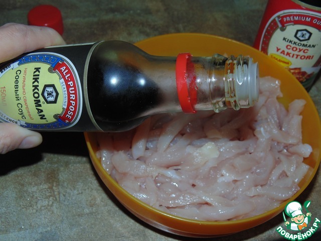 Филе нарезала тонкой полоской. Полила соевым соусом Киккоман.