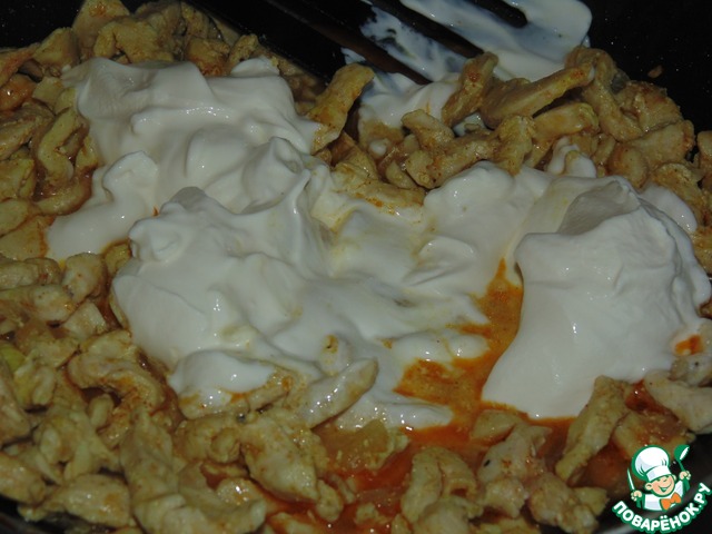 Добавила сметану, перемешала и готовила ещё 3-5 минут. Я подавала с картофельным пюре.