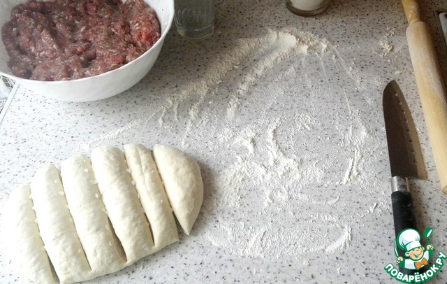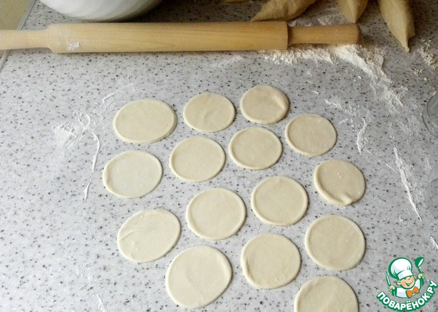 И так, разрежем наше тесто на 6 равных частей, так удобней раскатывать тесто, раскатаем, вырежем стаканом круглое тесто, разложим начинку и начинаем лепить