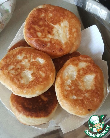 Прошло 30 минут, достаем тесто и разделяем его на небольшие шарики. Берем тесто, делаем в середине углубление и кладем туда нашу картошку с луком, защипываем края и придаем форму шарика. Наливаем масло в сковороду и смотрим чтобы масло стало очень жидким. Жарим пирожки с двух сторон. Пирожки кладем в миску (тарелку), на дно которой заранее кладем бумажное полотенце, либо салфетки. Бумага будет впитывать весь лишний жир. Готовые пирожки накрыть полотенцем.