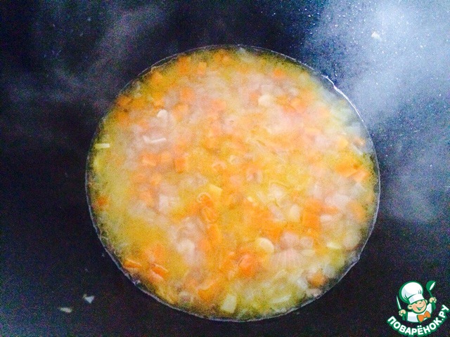 Буквально через полминуты влейте немного воды (или бульона), закройте крышкой и томите 10 минут на медленном огне.
