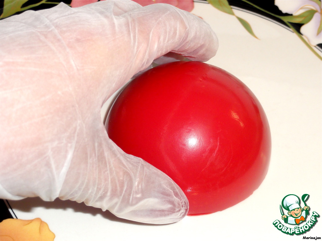 Нужно соединить полусферы, для этого на разогретой в микроволновке тарелке расплавляем грани полусфер и аккуратно их соединяем. Чтобы не оставить следов на поверхности шаров, необходимо надеть перчатки.