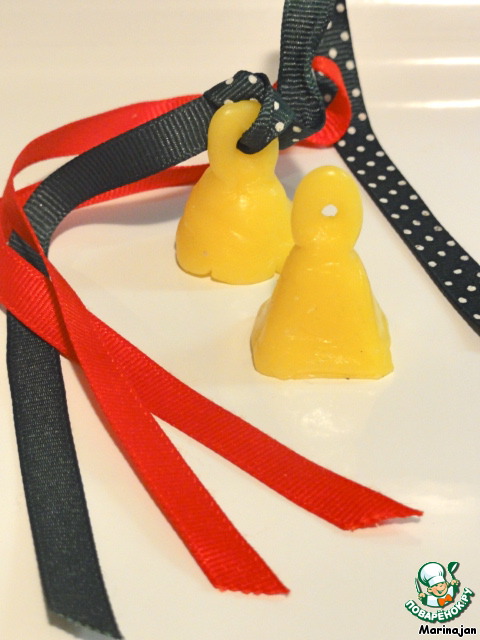 Пока они теплые делаем отверстие и просовываем ленточки.