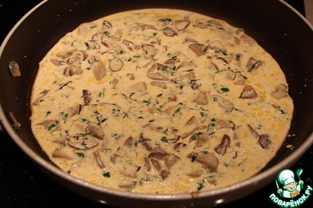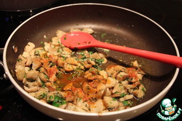 Грибы нарезать небольшими кусочками и добавить в сковороду. Посолить и обжарить минут 5 (если грибы заранее сварены). В моем случае грибы были свежемороженые, поэтому я тушила их на небольшом огне 15-20 минут. Добавить петрушку, паприку, сливки и потушить еще пару минут.
