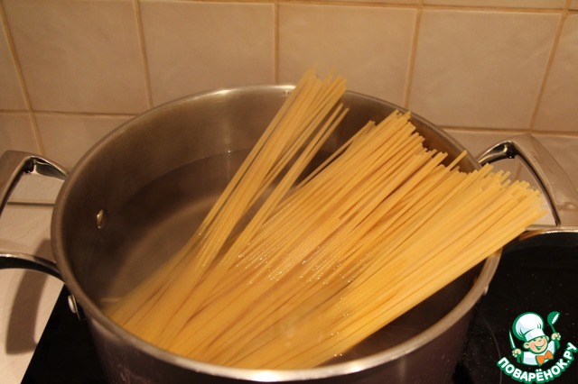 Сварить спагетти согласно инструкции на упаковке и откинуть на дуршлаг.