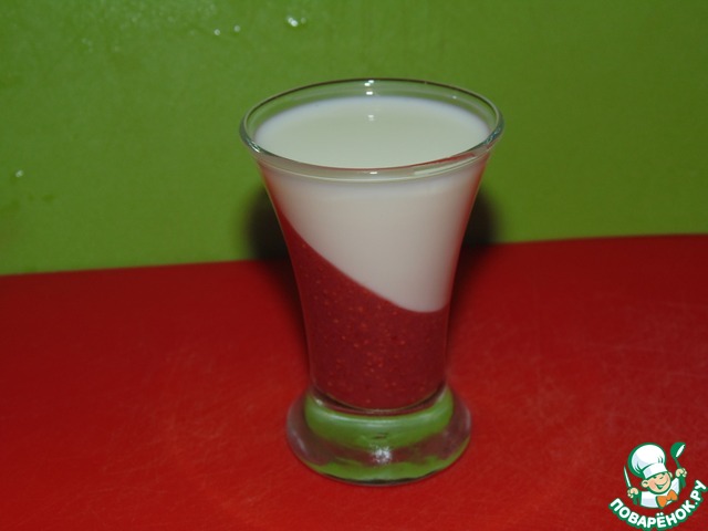 Когда нижний слой чуть-чуть застыл, налила сливочный и отправила в холодильник на ночь. Получилось 10 рюмок по 40-45 мл.