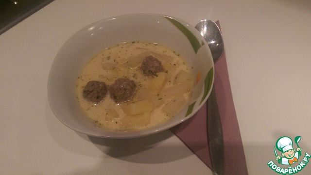 Снижаем огонь и добавляем плавленый сыр. когда сыр окончательно расплавится, добавляем сливки, петрушку, соль, перец, возвращаем поджаренные шарики назад в суп.