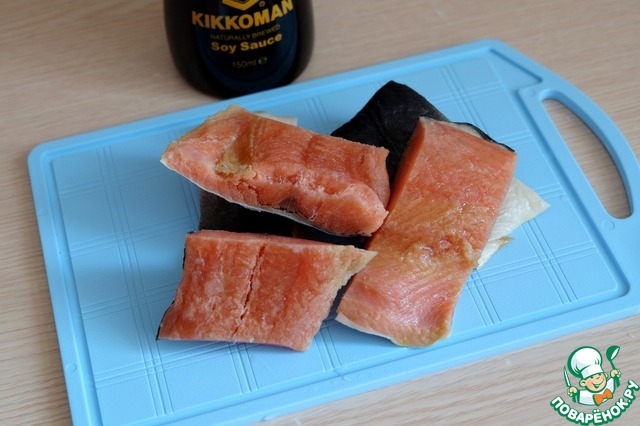 Филе горбуши порезать кусочками шириной примерно 3,5-4 см.