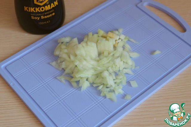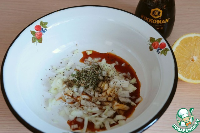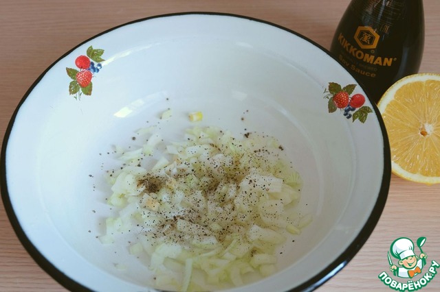 Добавить пряную сушенную зелень (1 ч. ложка), добавить соус ТМ Kikkoman, добавить лимонный сок (2 ст. ложки). Смесь хорошо размешать.