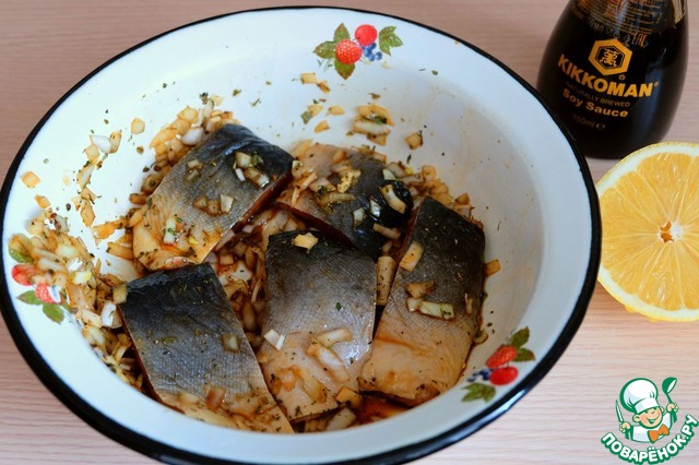 Кусочки горбуши хорошо смазать приготовленной смесью. Выдержать в маринаде в течение 20-30 мин.
