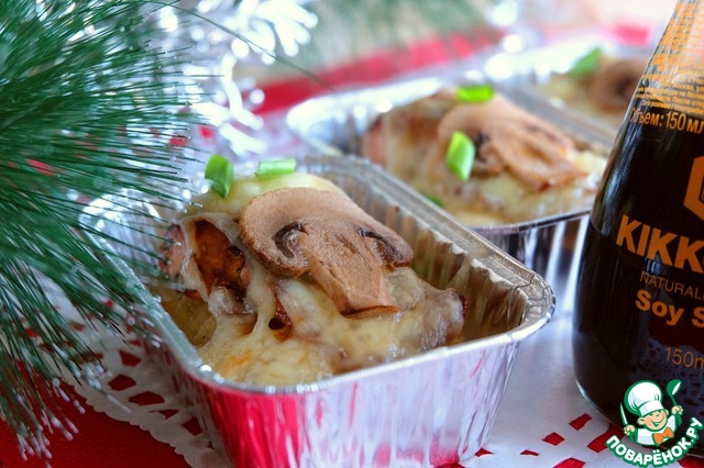 Затем достать из духовки, посыпать натертым сыром, выложить сверху порезанные пластиками шампиньоны и вернуть в духовку для подрумянивания блюда на гриле.