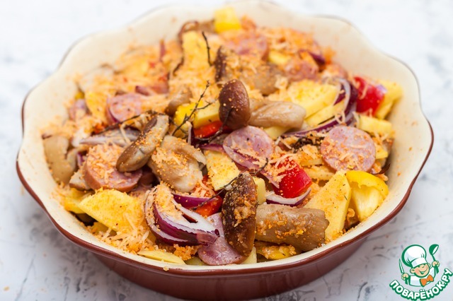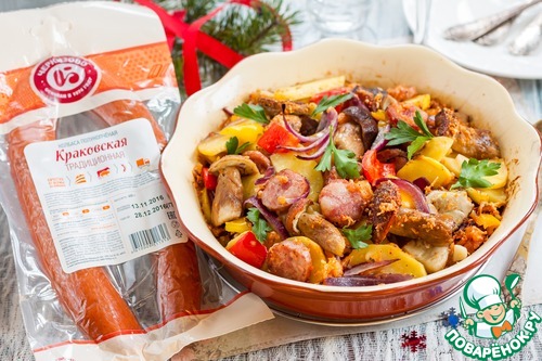 Набор продуктов. Для рецепта я использовала полукопченую колбасу "Краковскую традиционную" ТМ Черкизово, подкопченый вкус и аромат которой будут как нельзя кстати в этом блюде. Грибы у меня белые, но можно взять любые. От красного и желтого перца я отрезала по половинке, чтобы цвет у блюда был ярче и наряднее.
