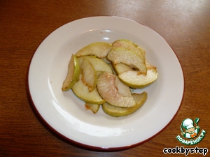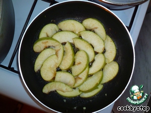 На ту же сковороду, где был обжарен лук, положить нарезанное на дольки зеленое яблоко. Обжарить с двух сторон на медленном огне до тех пор, пока дольки яблоки не станут мягче.