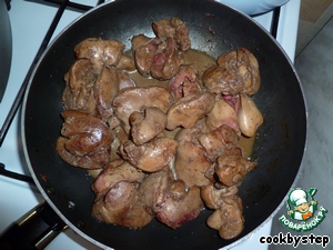 На той же сковороде, где жарились лук и яблоко, обжарить куриную печень до полуготовности (2-4 минуты).
