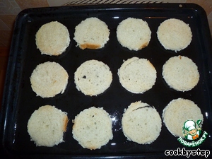 На противень, смазанный подсолнечным маслом, положить ломтики хлеба (желательно, заранее обрезать их ножом или стаканом до круглой формы).
