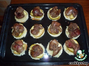 На канапе поместить куриную печень. Запекать в духовке 5-7 минут для того, чтобы канапе пропиталось соком, а ломтики хлеба немного подрумянились.