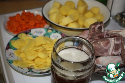 Мясо у меня было кусочек шеи и нога уже нарубленые на крупные кусочки. Пиво у меня пилснер собственного производства.