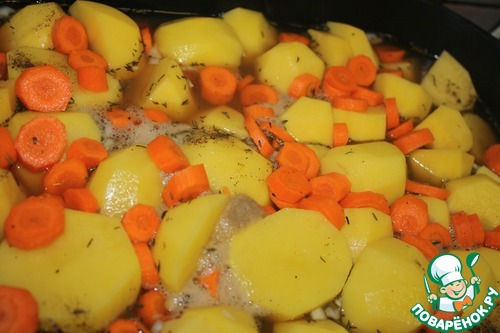 Смазать дно казана маслом и выложить картошку нарезаную шайбами, в процессе варки этот слой картошки превратится в соус. Присолить и поперчить, во время закладки продуктов я присаливаю каждый слой. Затем засыпаем половину нарезаного лука. Поверх лука укладываем мясо, опять солим, перчим и посыпаем тимьяном. Потом опять лук. Поверх лука идет картошка четвертинками и в конце морковь. Наливаем пиво и затем воду. Воды доливаем чтобы чуть чуть не доставало до верха.