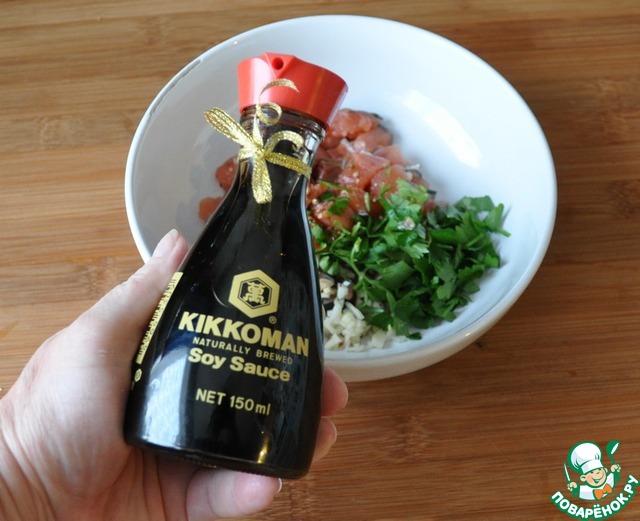 Наливаем соевый соус Kikkoman, перемешиваем.