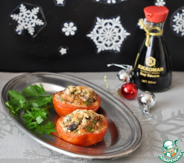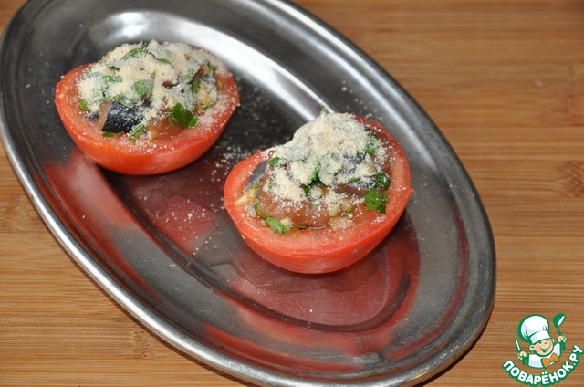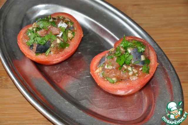 Форму для запекания смазываем маслом, кладём половинки помидоров и плотно фаршируем их с горкой рыбной начинкой.