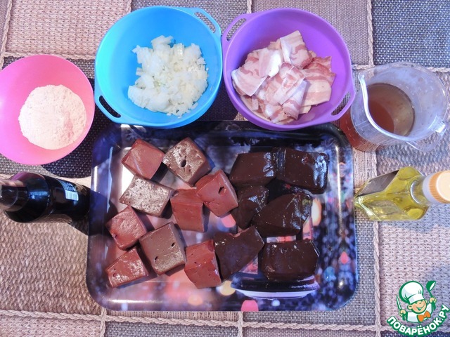 Печень режем довольно крупно, кубиками примерно 5*5 см. Бекон режем произвольно, можно кубиками или полосочками. Лук режем мелко