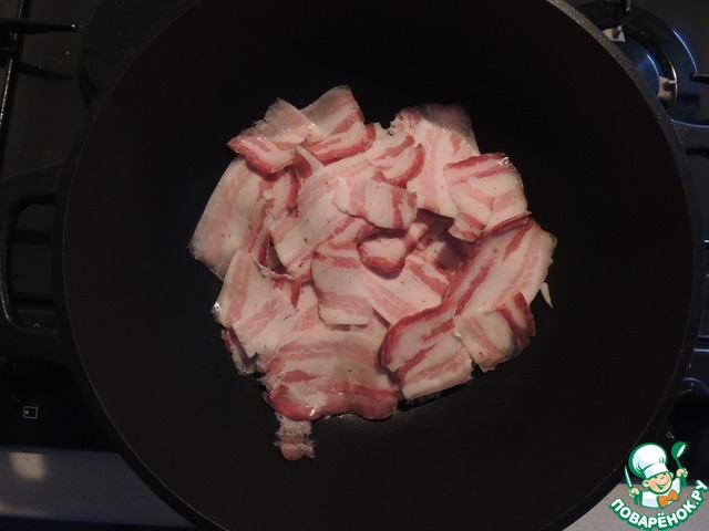 Берем сковороду с анти пригарным покрытием, добавляем немного оливкового масла или любого другого растительного, и начинаем обжаривать лук и бекон. Я немножко сглупила и обжарила лук вместе с беконом, но нужно это делать по отдельности, так как бекон необходимо довести до хруста, а лук за это время превращается в угольки