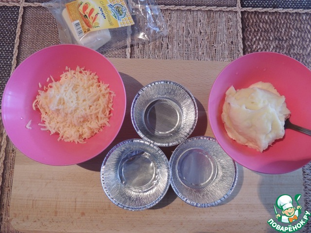Тем временем варим картофель и делаем пюре, любым привычным способом. Сливочный сыр трём на мелкой тёрке