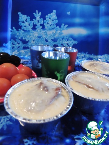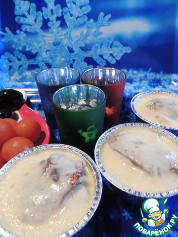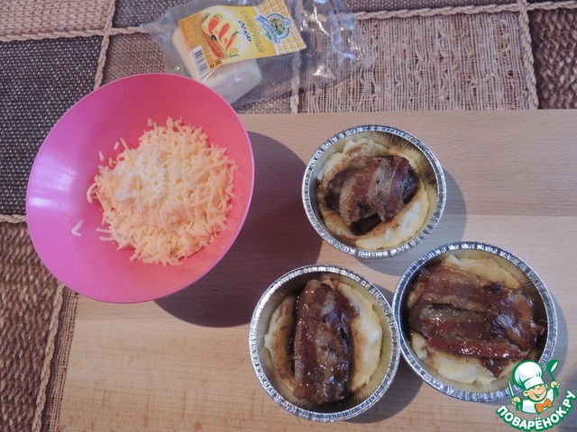 Берём формочки для выпечки из фольги и начинаем собирать наше блюдо. На дно каждой формочки выкладываем картофельное пюре, сверху кусочек печени и бекон, немножко утапливаем печень в пюре