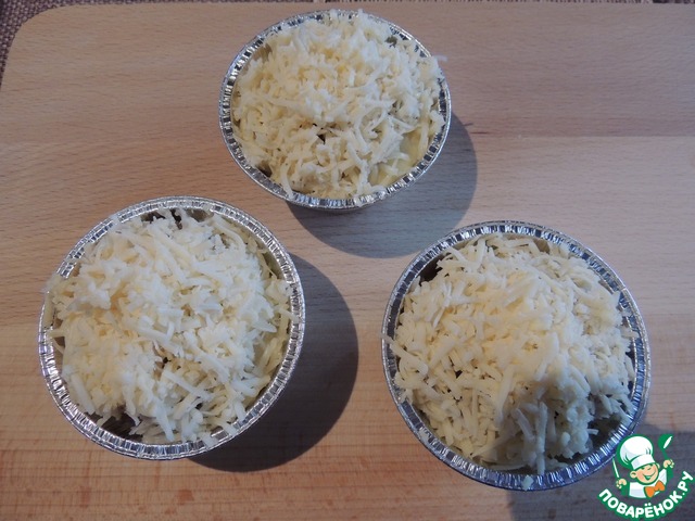 Засыпаем всё это дело сливочным сыром и ставим духовку минут на 5, только чтобы сыр расплавился